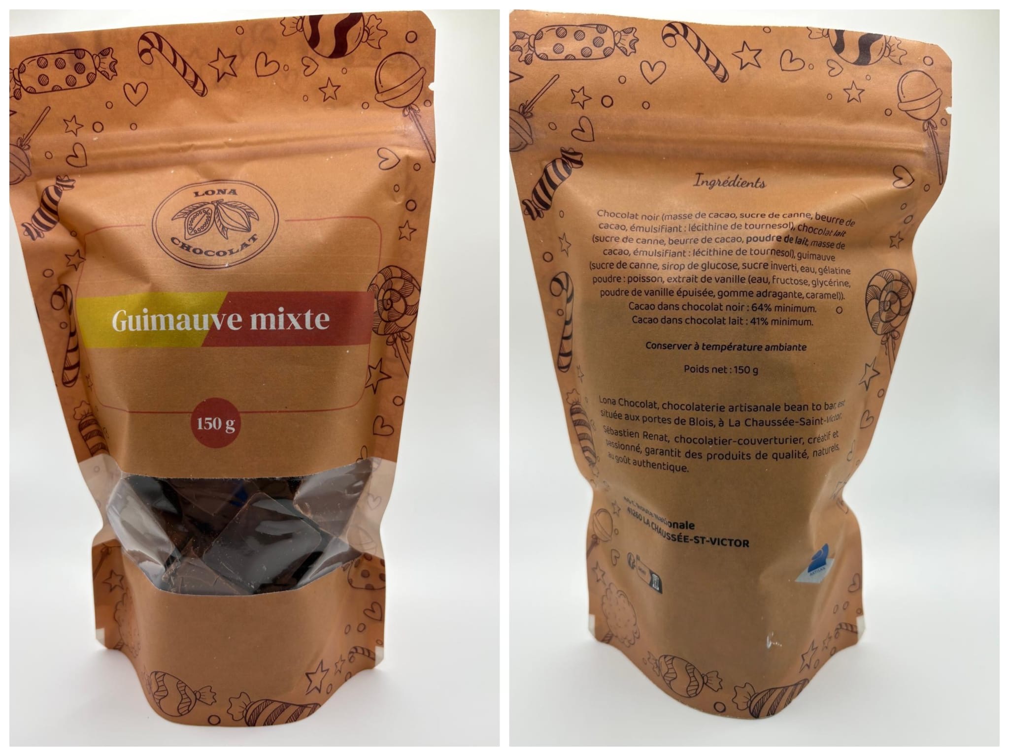 chocolat noir(masse de cacao, sucre de canne, beurre de cacao, émulsifiant: lécithine de tournesol)chocolat lait (sucre de canne, beurre de cacao, poudre de lait 26%, masse de cacao, émulsifiant: lécithine de tournesol) guimauve(sucre de canne, sirop de glucose, sucre inverti, eau, gélatine poudre: poisson, extrait de vanille(eau, fructose, glycerine,poudre de vanille épuisée, gomme adragante, caramel). cacao: 41% minimum cacao: 64% minimum