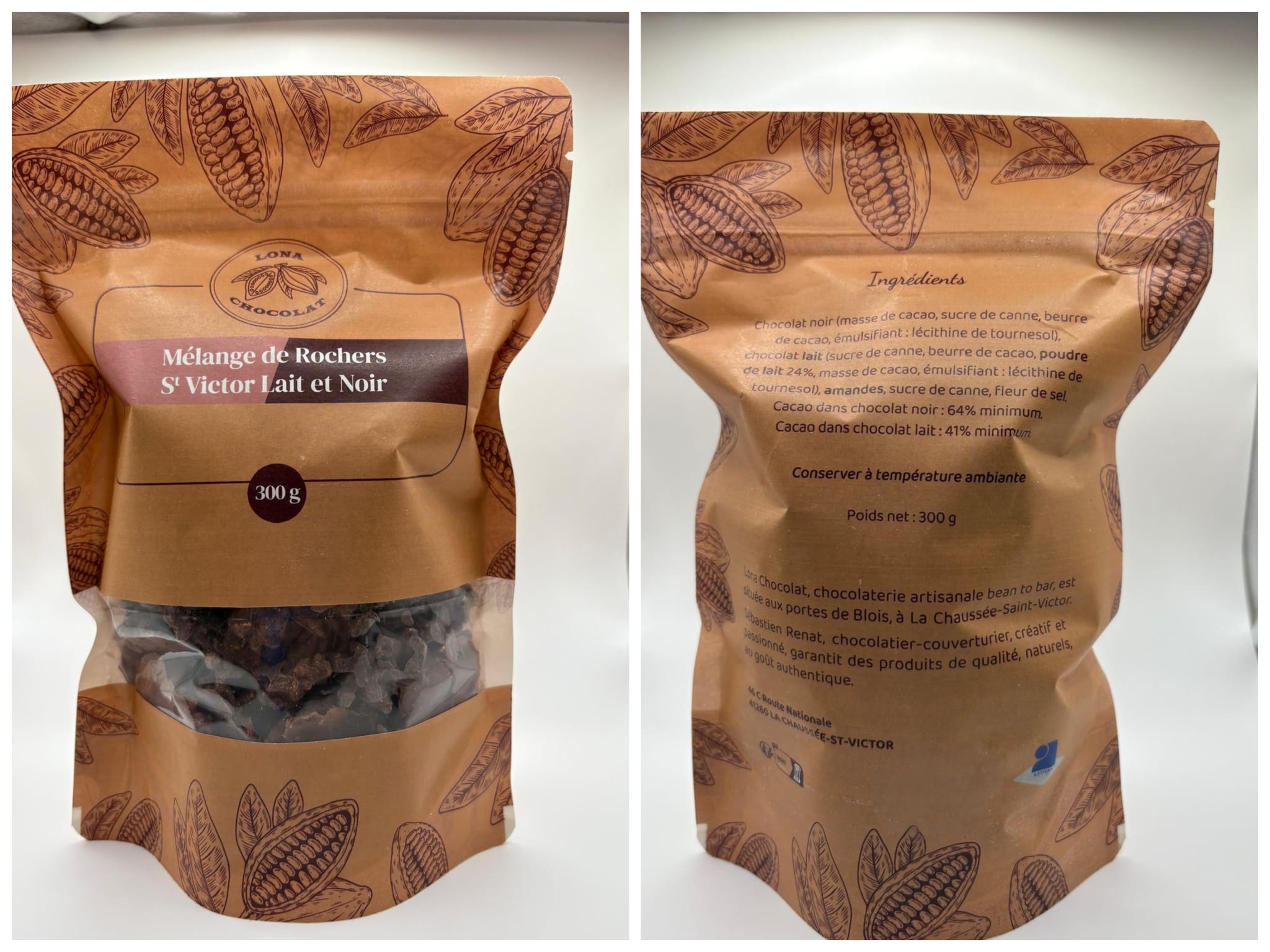 Batonnet amandes caramélisées avec une pointe de fleur de sel enrobée de chocolat noir 64% de cacao et chocolat lait 41% de cacao