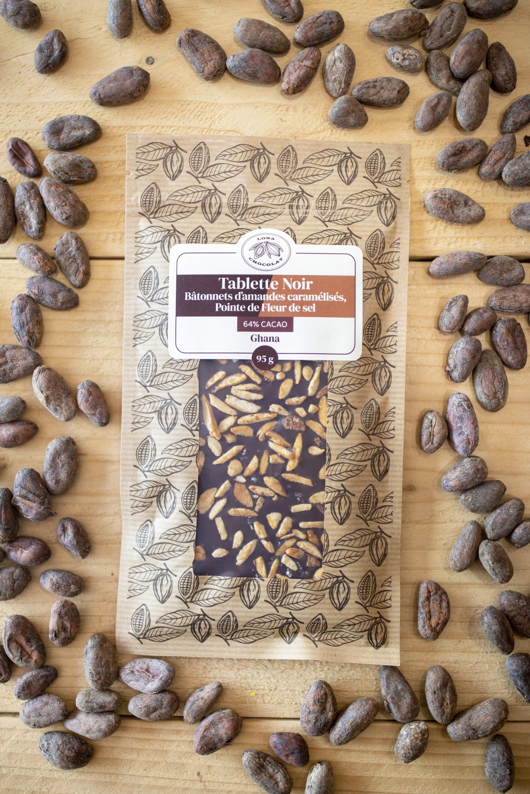 Broyage à partir de masse Chocolat noir ghana parsemé d’amandes caramélisées.