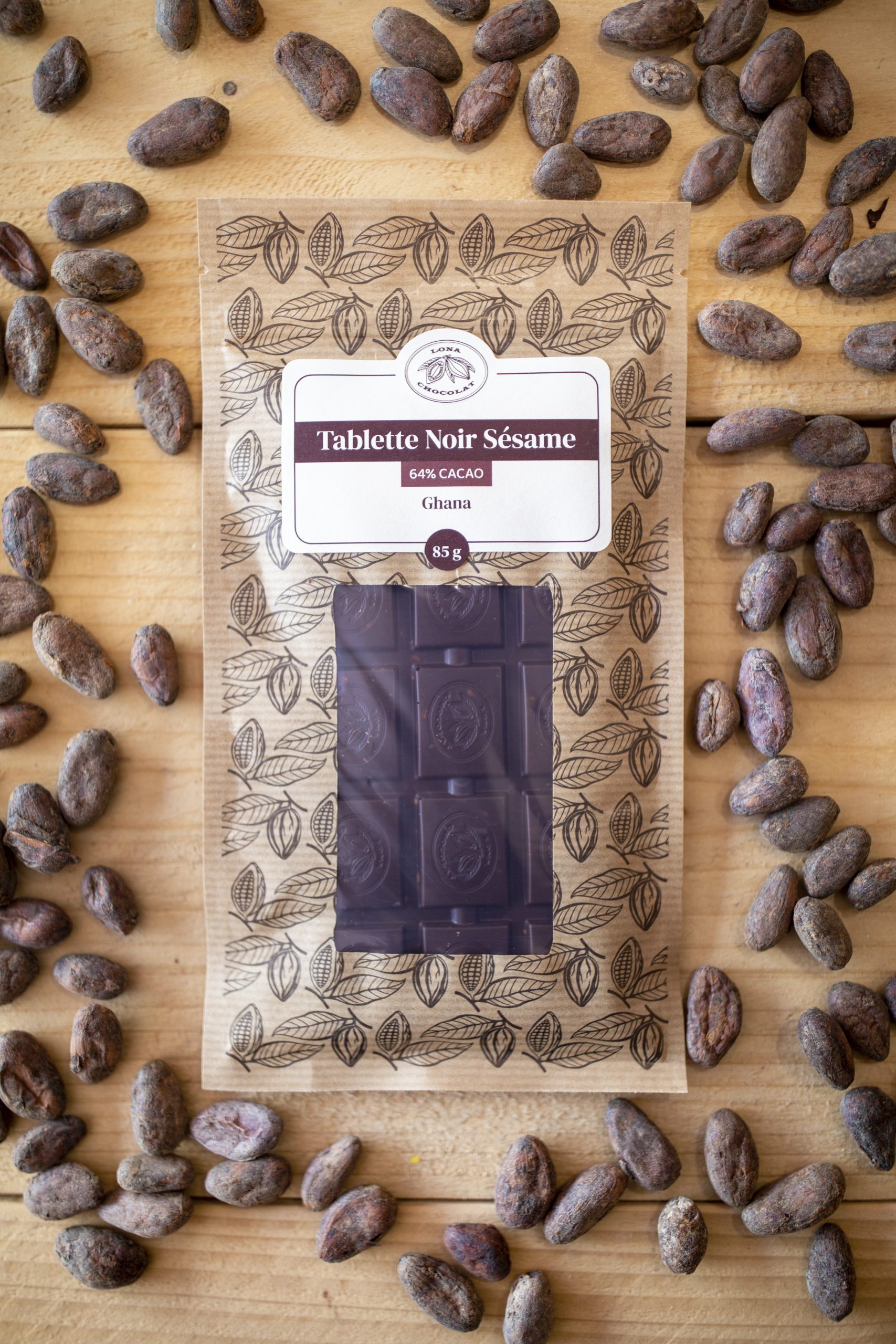 Masse de cacao, sucre de canne, beurre de cacao, sésame torréfié, lécithine de tournesol